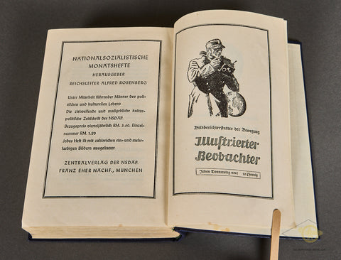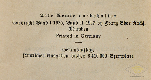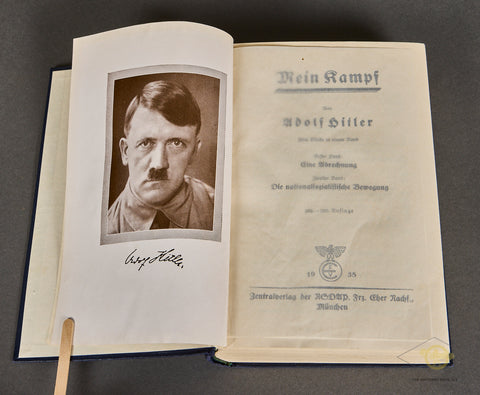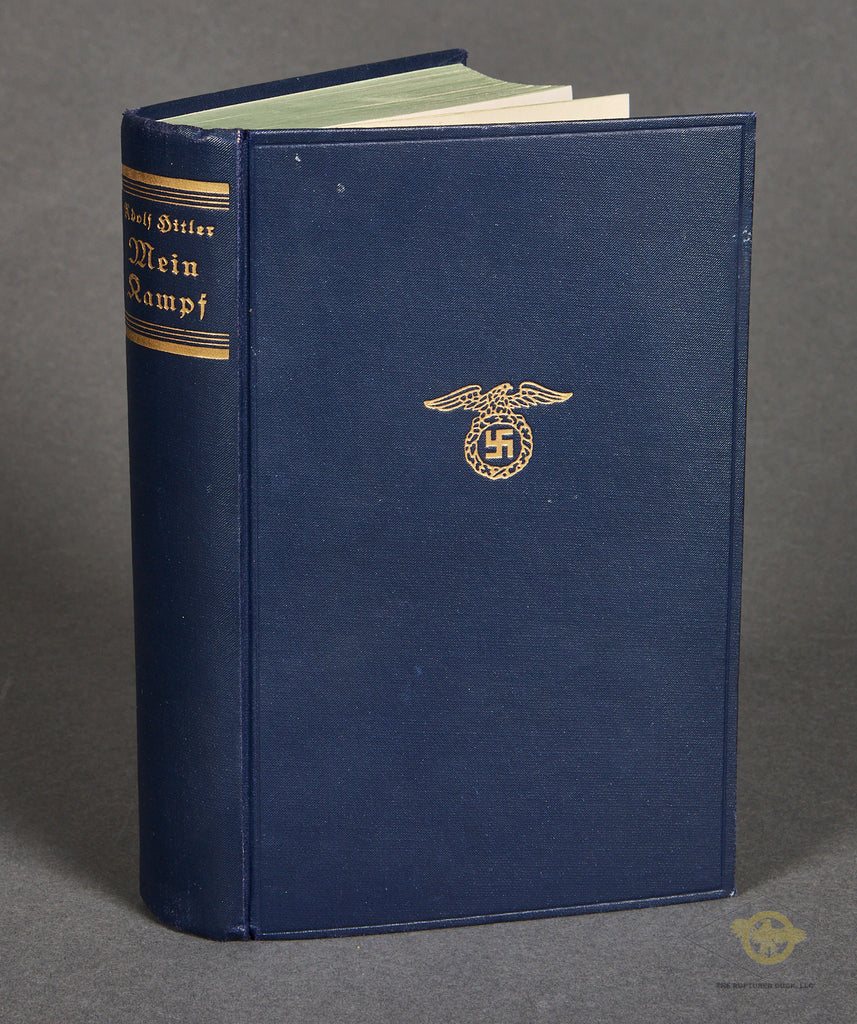 German WWII Mein Kampf-This is the 1938 Dated Adolf Hitler's Mein Kampf. This blue hardcover edition shows slight wear. The dustcover is missing on this copy. The photo of Hitler inside is intact and also in great condition. The book is very clean. There is a “heil Hitler” inscription written on the inside page.