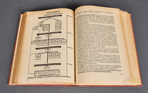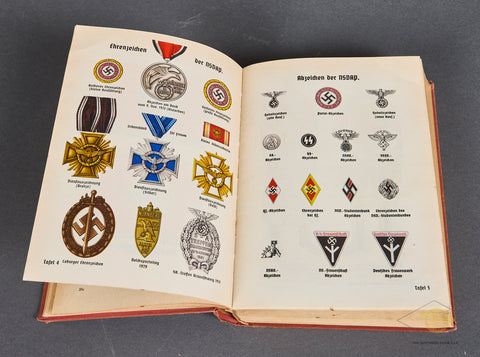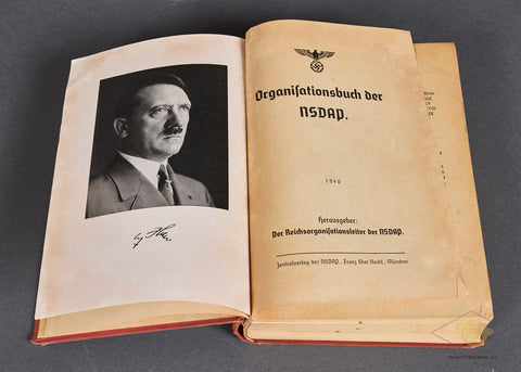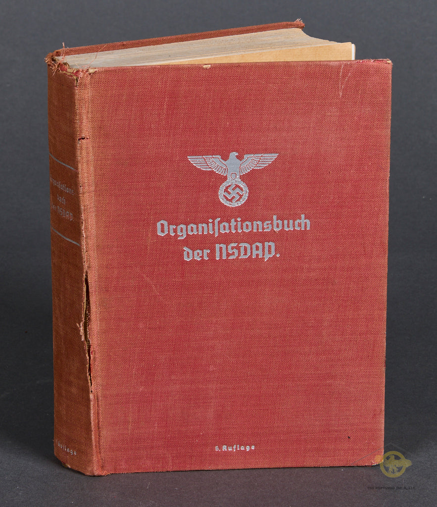 Organization Book of the NSDAP (Organisationsbuch der NSDAP)-This book is always popular when we get a chance to offer one. This red hardcover book is one of the most important books published during the Third Reich. Written by the infamous Dr. Robert Ley, it contains illustrated information about the membership, political leadership, uniforms, symbols, insignia, service requirements, flags, standards, daggers, swords, and other equipment of the many paramilitary units that made up the NSDAP or Nazi Party. It was published in 1940 by the Reich organizer of the NSDAP. This 613-page book opens with a Hitler portrait frontispiece facing the title page. There is a full index followed by a foreword by Adolf Hitler, a few words by Rudolf Hess and an introduction by Reichs Organizations Leader Dr. Robert Ley. The SA, SS, HJ, NSKK, RAD, etc., is dissected and explained so that anyone who had the need could understand all the specifics of how it was organized, the uniforms its members wore, and the requirements and responsibilities of membership in it. These pages contains both black and white and color illustrations. Written in German, this book was commonly confiscated and destroyed by the Allies; very few of these remain, and very few in good condition. This book is very good but somewhat fragile considering its age. Tight binding, inside pages very clean though evenly age toned. There is a nameplate sticker on the inside cover. The cover is in good shape, though the spine has some loose spots and a few scuffs, it is also torn slightly on the side. This is a real beauty and again, a scarce example of this very interesting book.