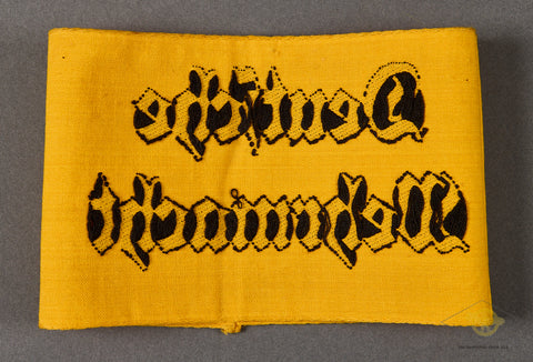 German WWII Armed Forces Worker’s Armband-It has a bright, clean yellow cloth body with printed wording which reads “Deutsche Wehrmacht.” It shows only light wear and retains very nice colors. There is a very nice issue number of 1503 stamped at the bottom of the armband. This is very clean and in very good shape.