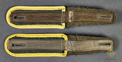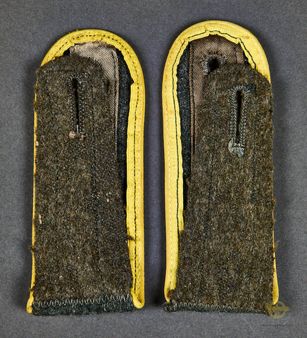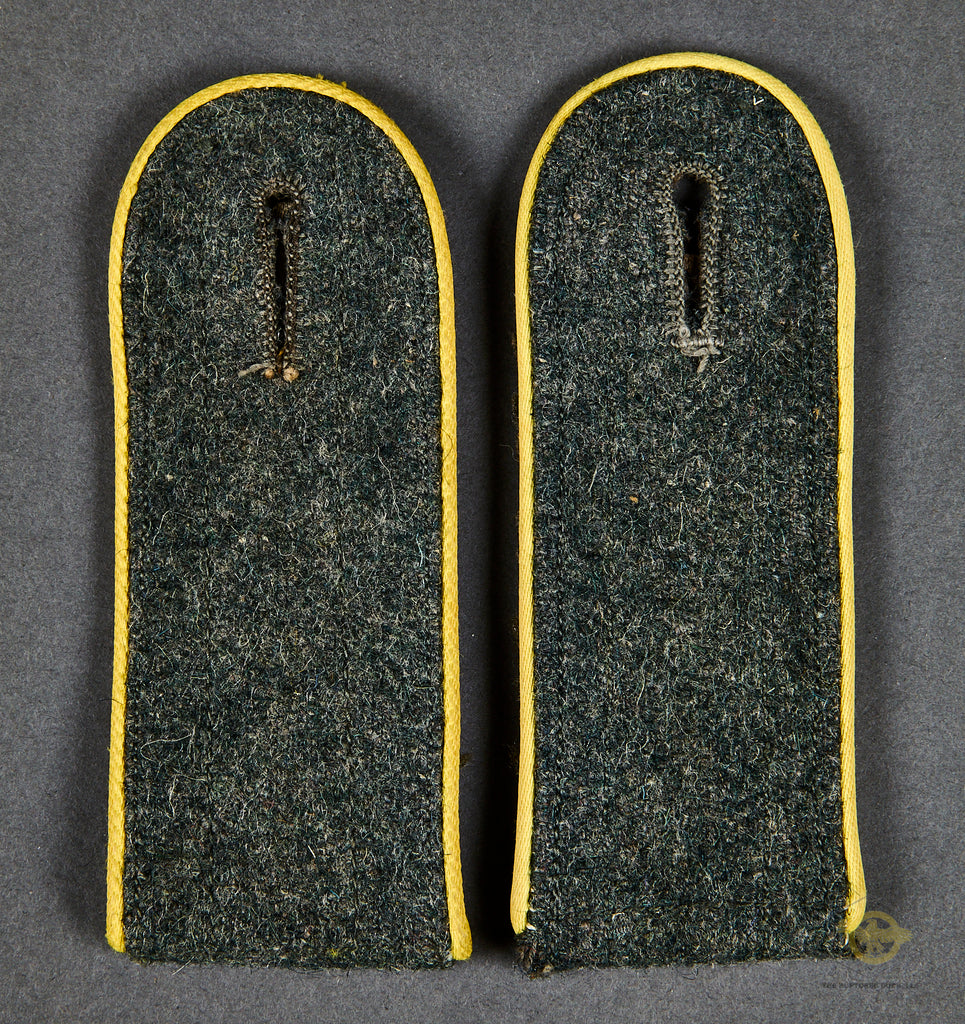 German WWII Army Enlisted Man’s Signals Slip on Shoulder Boards-This is a set of gray wool slip on shoulder boards, piped in yellow for an army signals troop. These are in excellent condition!