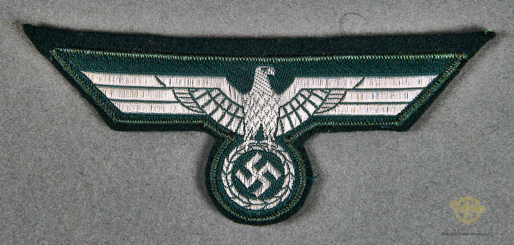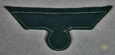German WWII Army (Heer) NCO Breast Eagle-Silver flat wire open wing breast eagle on dark green background. This sits on a dark green wool badge cloth and appears to be unissued. Overall, this is in excellent condition.