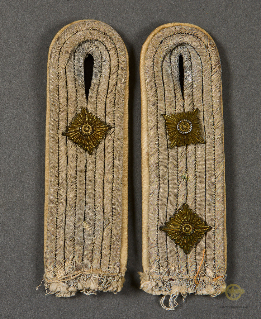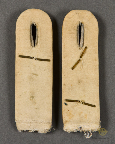 German WWII Army Infantry Captain Sew In Shoulder Boards-This is a great wartime set. These shoulder boards are made of a subdued flat wire in a light gray color. One of the pips is missing on one of the boards, but the other three rank pips are in place, and retain the majority of their original gold finish. The boards are piped in white, and the white underlay. This appears darker due to age and storage. Overall, these are in good condition.