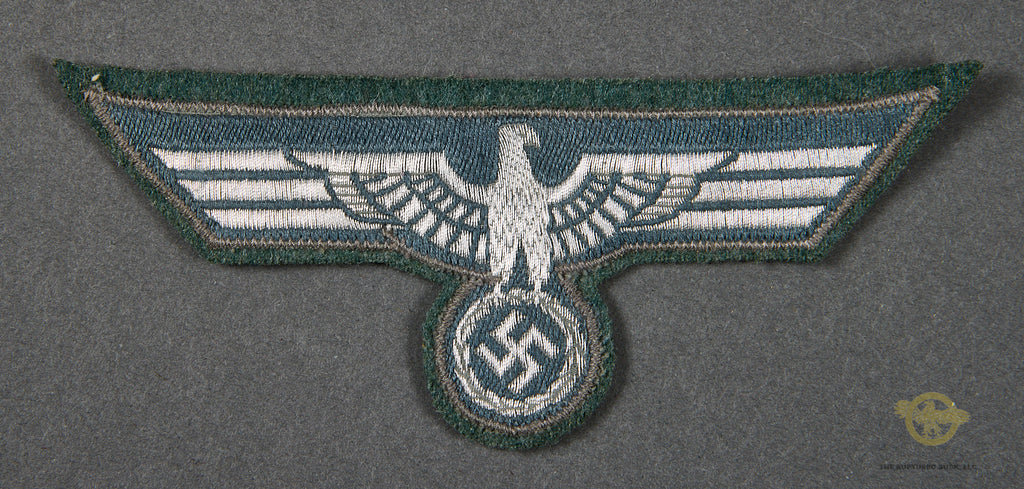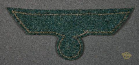 German WWII Army NCO Breast Eagle-This a handsome eagle in flat wire on a gray backing. This sits on a portion of army green wool badge cloth. This is near excellent.