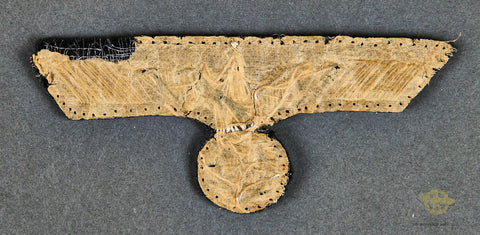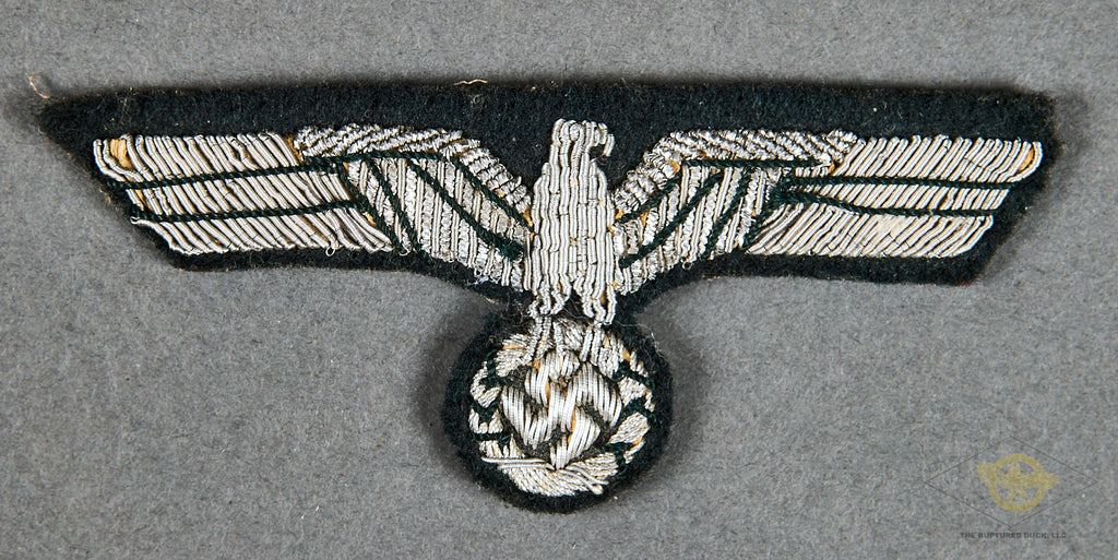 German WWII Army Officer’s Breast Eagle-This is a hand embroidered silver bullion eagle on dark green wool backing. The green wool badge cloth and the bullion is in very good condition. This appears to be unissued. The light brown paper backing is still in place on the reverse. Overall, it is in very good condition.