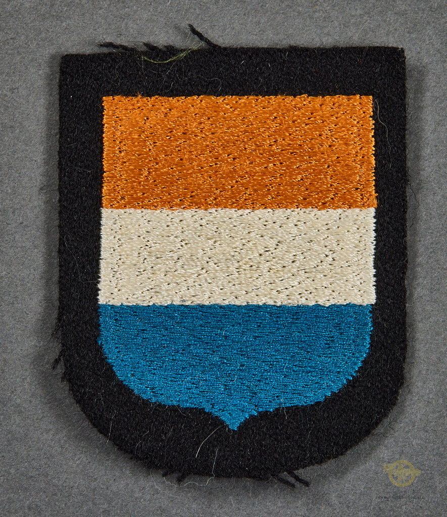 German WWII Dutch SS Volunteer Sleeve Patch-This Nederland sleeve is gorgeous with slightly faded, but clean colors on a black badge cloth. This was given to the Dutch assigned to 23rd SS Freiwilligen Panzergrenadier Division “Nederland”. It depicts the national shield of Holland. A machine woven example in orange, white, and blue cloth over black badge cloth. This example is in super clean, unissued condition.