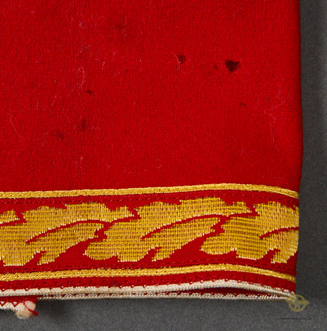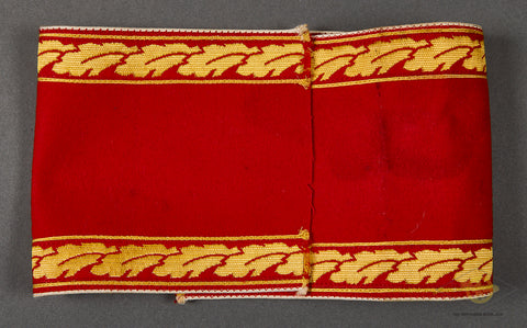 German WWII Kreisleiter Political Leader’s Armband-Super example of a textbook political leader’s armband for Kreisleiter Level. The upper and lower edges have narrow gold tresse oak leaves which are piped in gold celleon piping. There is a multipiece swastika that is trimmed in gold. This is for the title “Leiter Einer Hauptstelle” or “Leader of A Main Post”. It is Kreis level with white piping. This is in good condition with a “F” level paper RZM label affixed to the inside. It is not sewn together on the back. Please look closely at the photos as there are moth holes to the right of the swastika, and a moderate stain on the reverse. This is in good condition.