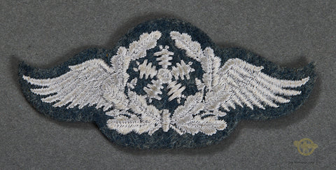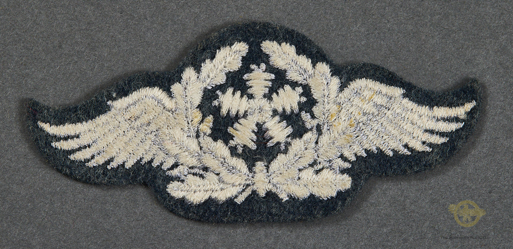 German WWII Luftwaffe Specialty Patch for Technical Personnel-Machine embroidered wings with a stylized propeller on a Luftwaffe gray badge cloth. It is non piped so would be worn by an EM. This patch is in very good condition.