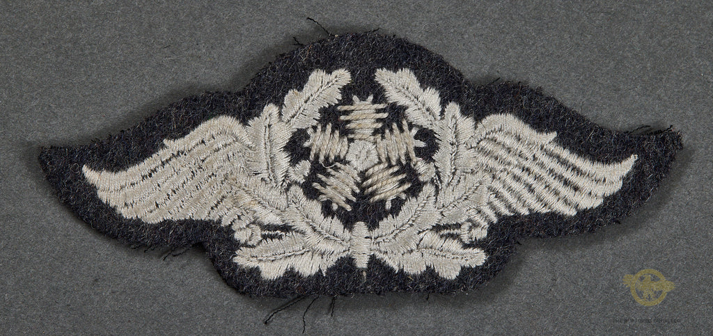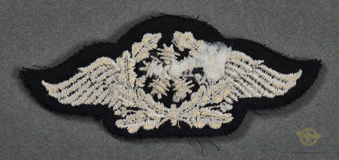 German WWII Luftwaffe Specialty Patch for Technical Personnel-Machine embroidered wings with a stylized propeller on a Luftwaffe gray badge cloth. It is non piped so would be worn by an EM. This patch is in very good condition.