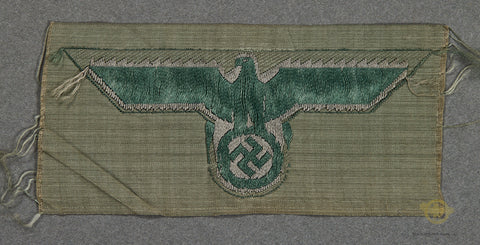German WWII M40 Army Breast Eagle-This is a handsome BeVo eagle in gray and green over an olive green rayon badge cloth. This is unissued and excellent.