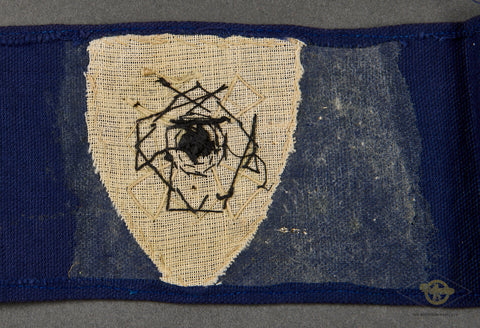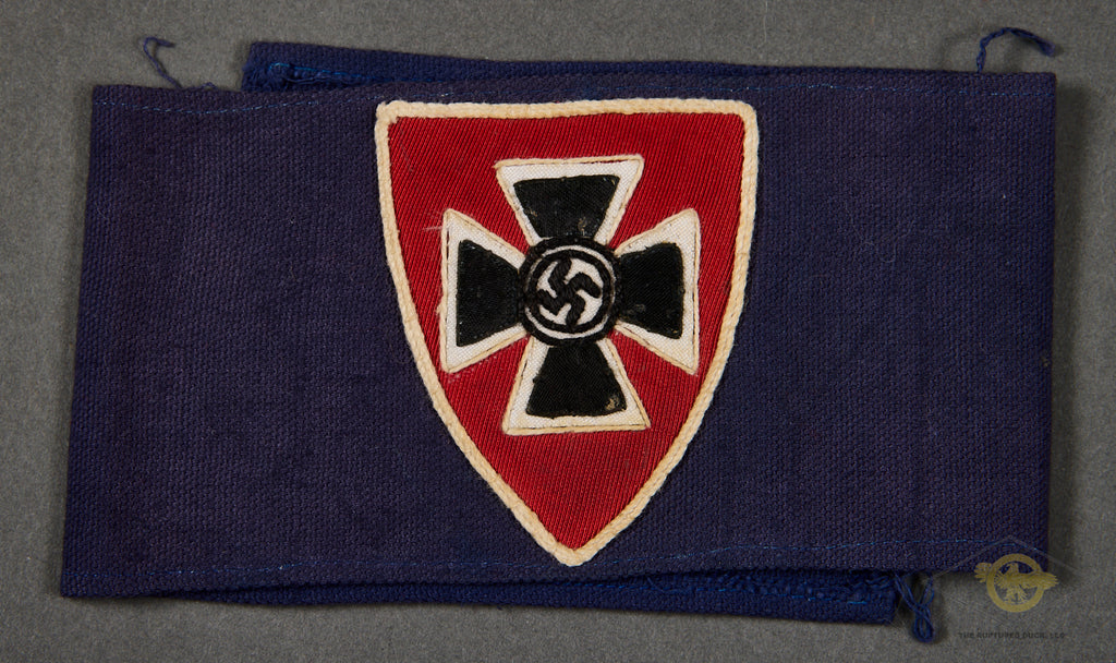 German WWII NS-RKB (Nationalsozialistisches Reichskriegerbund) Membership Armband-The NS-RKB was the umbrella organization for all German military veterans during the Third Reich. It was a successor to the earlier Deutscher Reichskriegerbund "Kyffhäuser. The NS-RKB was disbanded in 1943, and its members were drafted into the Volkssturm, which was the national militia. This is a membership armband, made in an unusual blue cloth, with the Kyffhäuserbund emblem centrally placed. The emblem depicts a cloth red shield with an embroidered black Iron Cross and a swastika at its center. This armband is not sewn together in the back. It is in very good condition. This is an armband that we do not see very often.