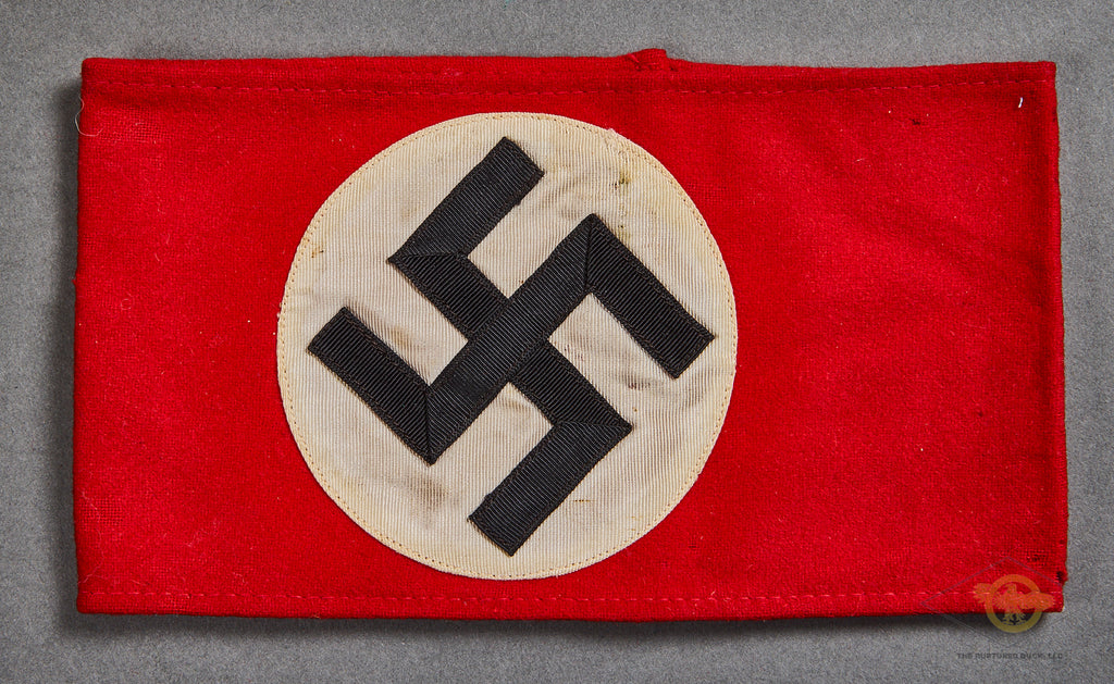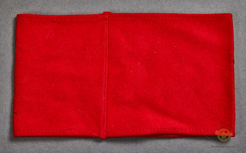 German WWII NSDAP Wool Party Armband-This is a handsome red wool armband that shows some very light moth tracking and one moth hole on the reverse. It has a separately applied white ribbed disc with a multipiece swastika applied. The white does show a few pin up holes and slight discoloration. There is a very nice “D” level RZM tag affixed to the inside. This armband is sewn in the back. Overall, this is in good condition.