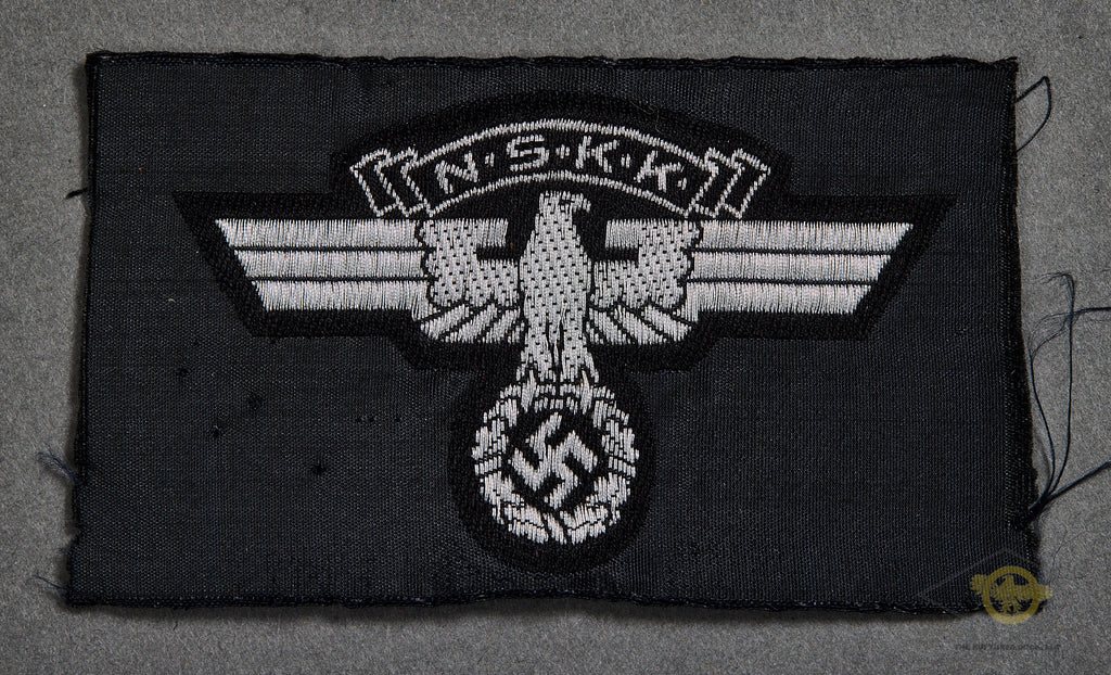 German WWII NSKK Sleeve Eagle-This is the second type patch. This is an NCO sleeve eagle in silver flat wire over black rayon badge cloth. This has a terrific “A level RZM tag on the reverse.  It is unissued and in fine condition!