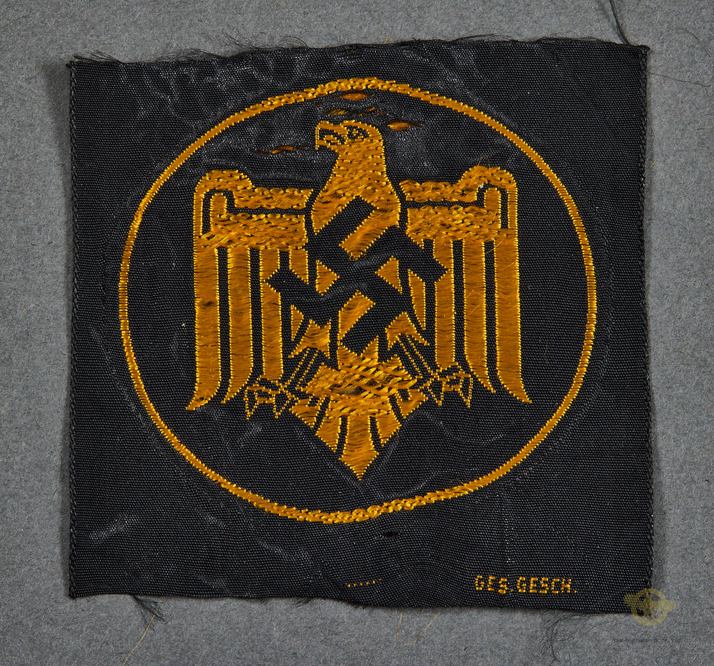 German WWII NSRL/DRL Sports Insignia-This would have been worn on a shirt sleeve. This is a beautiful BeVo embroidered example, with bright orange thread on a dark brown backing. GES.GESH is embroidered on the bottom. Unissued example. This patch has some discoloration to the rayon, on the top and the bottom. Please be sure to look closely at the photos.