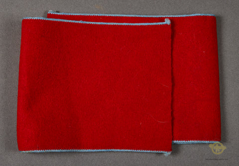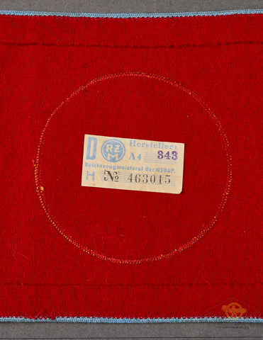 German WWII Political Leader for Anwärter (ORTS Level)-Red wool armband with a black BeVo swastika trimmed in gold embroidered onto a white ribbed rayon disc, which is applied to the red wool field. It is piped in blue for Orts Level. This would be for an administrator (Anwärter) in the NSDAP. This armband a very nice “D” level RZM tag, and other than one small spot of white discoloration inside, this is in choice condition. This is not sewn together in the back.