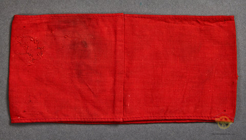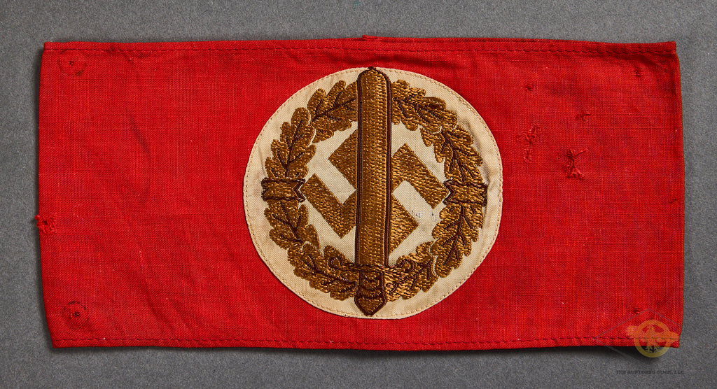 German WWII SA Sports Armband-Bright red cloth field with machine woven gold representation of the SA Sports Badge as its central motif. This is applied to a separately attached white disc which does have a slight bit of age discoloration. This was displayed, you can see some remnant pin holes, and some actual tears to the front and the reverse. Someone has attempted to patch the holes on the reverse with a piece of tape, or a glue. Please see photos. These were worn by sports umpires, timekeepers and track officials, as well as other NSDAP formations competing for the SA Sports Badge. The ends are sewn together. This is a sound example.