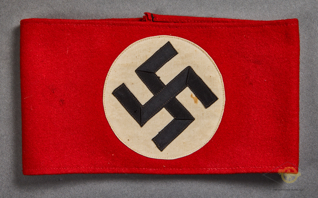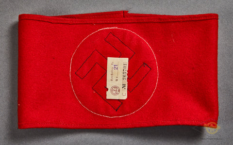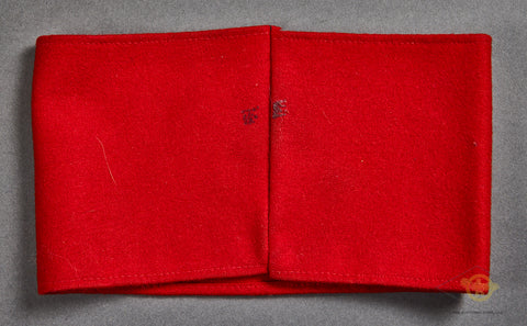 German WWII Wool NSDAP Party Armband- This is a handsome red wool armband that shows some very light fading but no moth damage. It has a separately applied white ribbed disc with a multipiece swastika applied. The white does show even age toning, and a spot of discoloration just under the right swastika arm. There is a very nice “C” level RZM tag affixed to the inside. This armband is sewn in the back. There is an old piece of tape still attached to the reverse which we haven’t attempted to remove. Overall, this is in good condition.