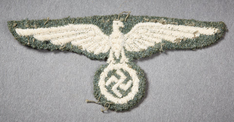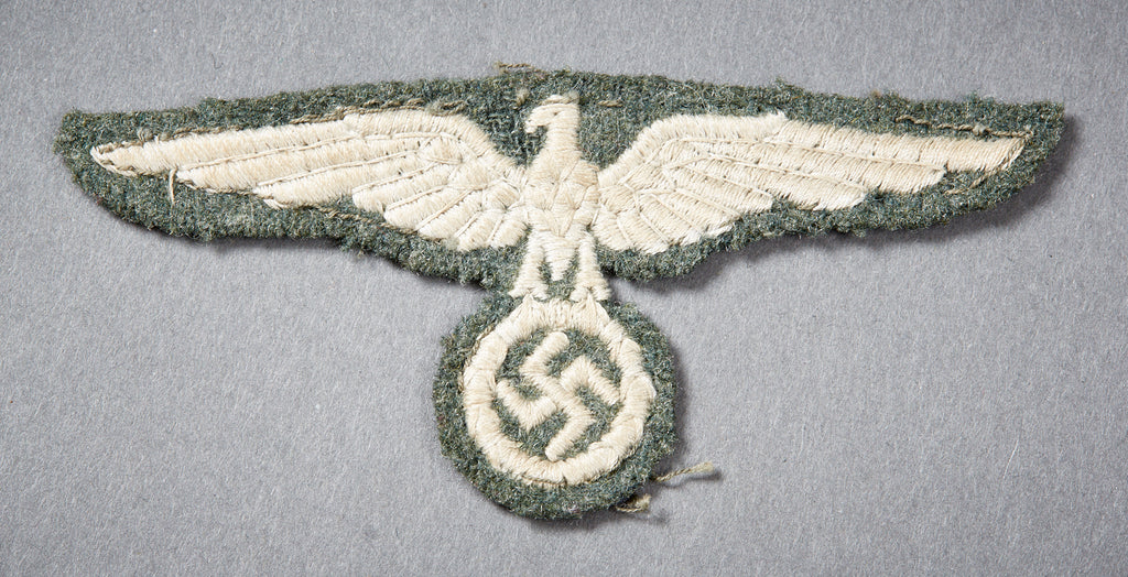 SS First Pattern Sleeve Eagle-This is the first pattern used. It is machine embroidered in off white cloth over green. It is very clean but has been removed from a sleeve. Desirable!