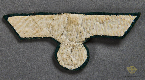 Veteran Bring Back German WWII Army Officer’s Breast Eagle-This looks to be unissued. This army officer’s breast eagle is made of a bright silver bullion on a black badge cloth. The white backing is still in place. A desirable example. This army eagle was brought home by a US veteran. We will supply the name of this soldier to the buyer.