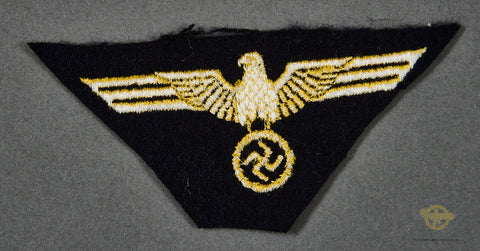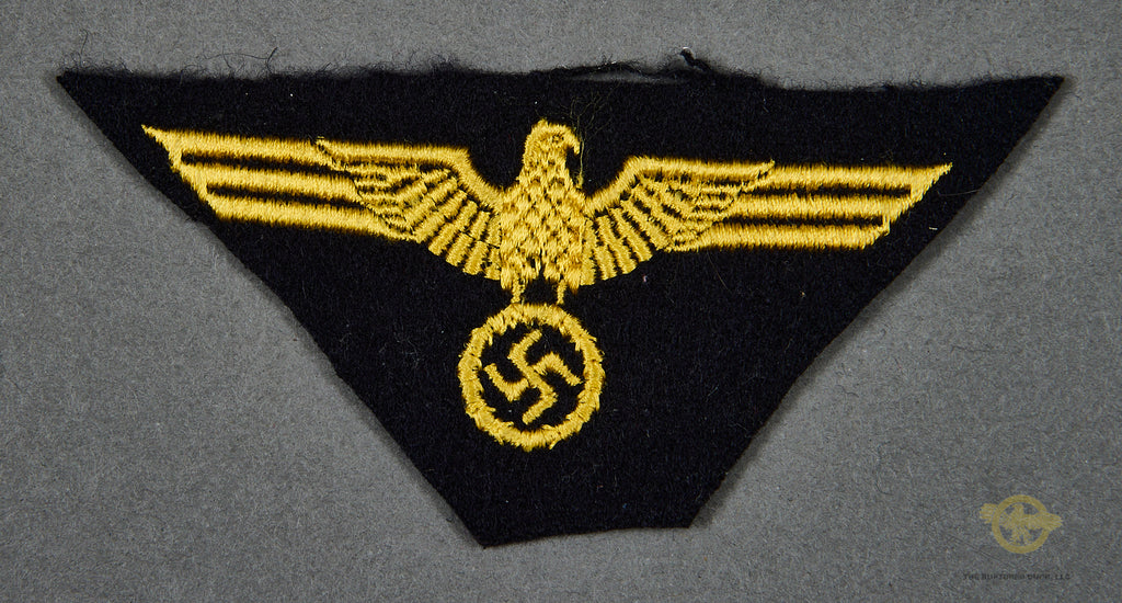 Veteran Bring Back German WWII Kriegsmarine Breast Eagle for Other Ranks-An unissued example of the Navy breast eagle, machine embroidered in gold over a blue wool backing. Unissued and in mint condition. In fact, we have several of these, and the one you receive will be as nice if not better than the one in the photo. We were lucky enough to purchase this directly from the family of the US veteran who brought this home, we will supply the name of this soldier to the buyer.