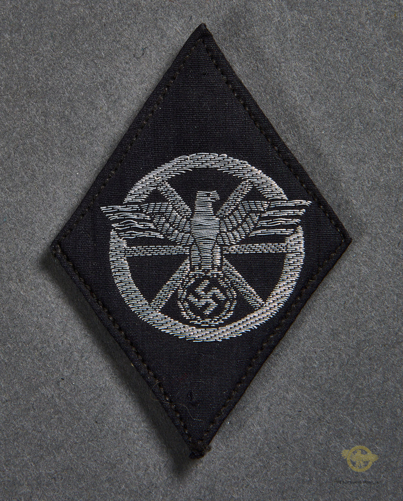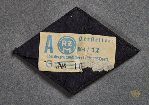 Veteran Bring Back German WWII NSKK Sleeve Diamond-This NSKK sleeve diamond would be worn by EM drivers. This is in the second pattern, with wings that extend beyond the spoked wheel. The NSKK National emblem is rendered in machine woven silver thread onto a black rayon diamond body. There is a soft stiffener inside making this feel a bit thicker. There is an RZM tag on the reverse, the tag does have some damage to the lower right edge, please see photos. This is a very desirable patch. This was brought home by a US veteran. We will supply the name of this soldier to the buyer