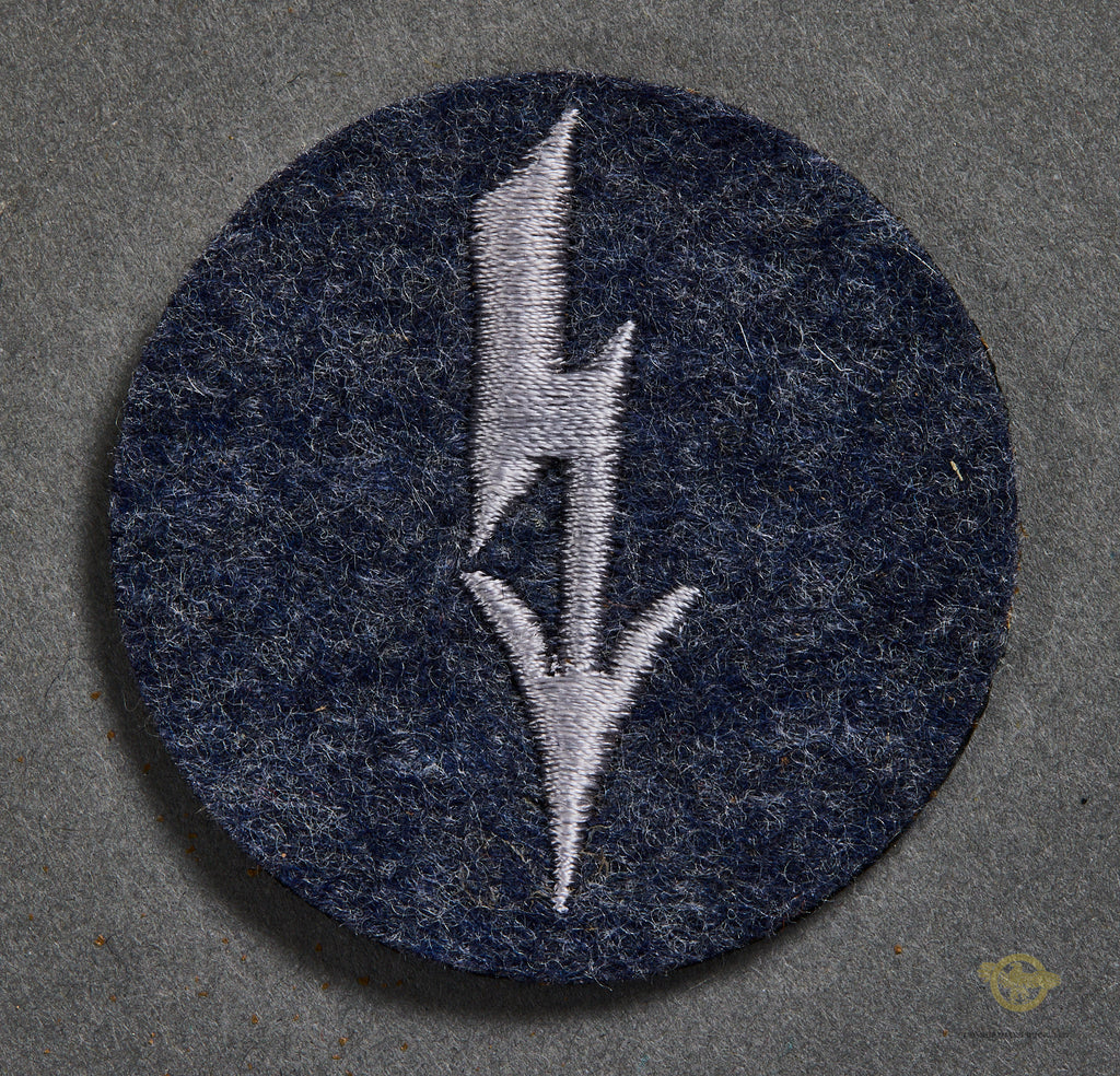 WWII German Luftwaffe Specialty Arm Patch-This is produced in blue grey badge cloth with silver grey insignia. This is for signals personnel, flying and flak branch. This patch still has the paper backing, so it was unissued. It is in excellent condition!