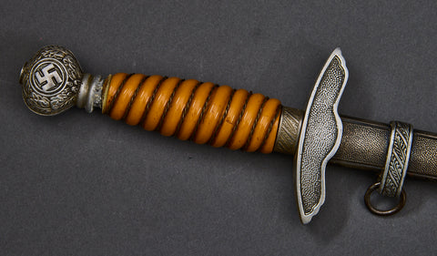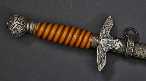 German WWII 2nd Model Luftwaffe Dagger-This is an unmarked example. The airplane gray nickel fittings are very good, as is the light orange celluloid handle with a toned twisted wire grip wrap. Be aware that there is some damage where the top of the grip handle meets the pommel cap. Please see photos. This is shame because otherwise, this is a very nice dagger. The leather buffer remains in place under the crossguard. The scabbard is also in very good condition. It has a darker gray tone to match the fittings. The blade is very good. It shows slight in and out marks. The blade is unmarked. Overall, despite the damage to the top part of the grip, this dagger is in very good condition and is priced accordingly. It would make a nice placeholder and is bargain priced.