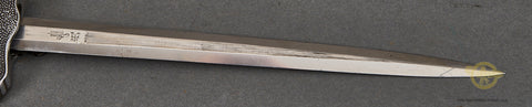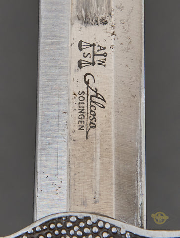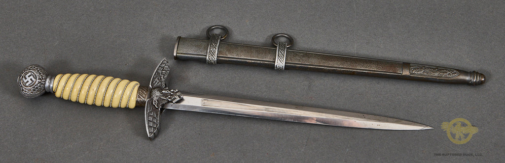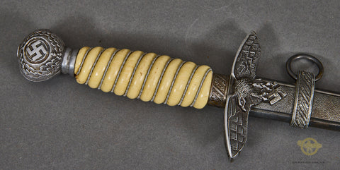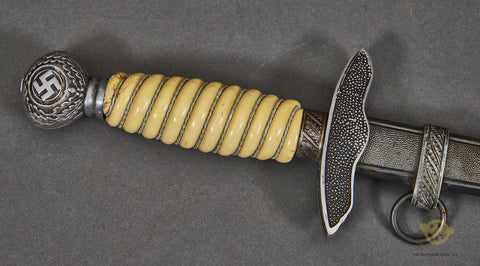 German WWII 2nd Model Luftwaffe Officer Dagger by Alcosa-This is a top notch example with white celluloid handle with twisted wire wrap in place. The celluloid handle shows some very light cracking at the top and bottom, so please be sure to look closely at the photos. This example has the airplane gray finish with approx. 90% of the plating intact. It shows excellent details. The pebbled scabbard is near excellent, with a tone that matches the upper fittings. he blade is excellent as well. This has the later Alcosa scales logo which we believe is 1941 and after. This is an excellent example of a 2nd model Luftwaffe dagger.