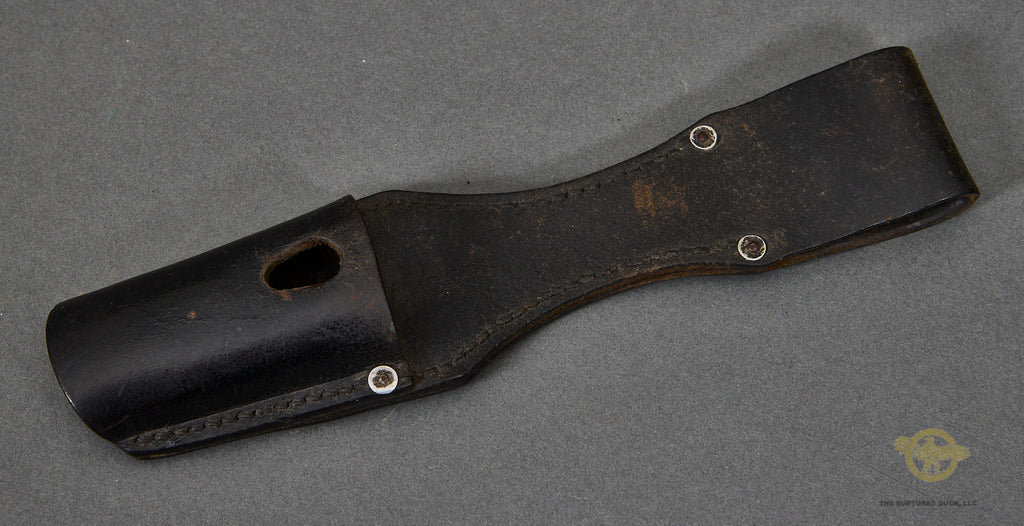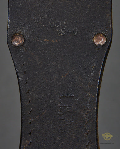 German WWII 98K Combat Bayonet Frog-This frog is constructed in a heavy duty brown leather, that is in very good shape. The leather is still soft and supple, with no cracking or crazing visible. The reverse is maker marked and you can read the date 1940. Sound example.