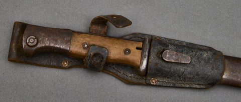 German WWII 98K Combat Bayonet-This is an untouched example. There is some surface rust on the hilt and crossguard. There are waffenamts is in place on the hilt. The mortise functions as it should. The wooden grip plates show wear from being handled, but this gives them a nice look. The two rivets are in place holding the grip plates tightly to the bayonet. The scabbard has a light coat of rust that matches the above fittings. This is a matching set. The scabbard has the serial number 2169. The blade is very good and retains its bluing. It has the matching serial number 2169 on the obverse, and the makers code of cux and date of 44. CUX is the code assigned to the maker C.U. Schmidt of Solingen, Germany. This blade is excellent. The dark brown leather frog shows discoloration from age and storage, but it is still pliable and looks great with this bayonet. Be aware that the stud on the retaining strap is missing. Overall, this is near excellent, with a very clean blade.