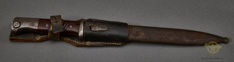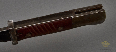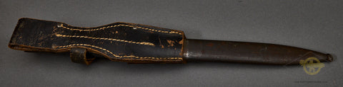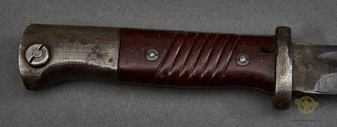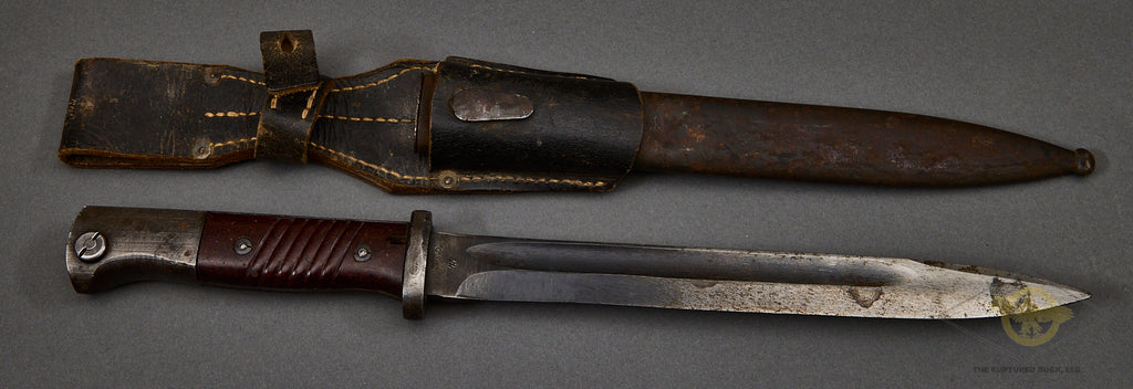 German WWII 98K Combat Bayonet with Matching Numbers by Hörster-This is a totally matched set. This is a late war bayonet. It is totally matched and dated 1944. This has the ribbed bakelite handles which are in fine shape, The bluing on the hilt and crossguard is 98% intact. The scabbard has lost its original finish, and the steel has a coating of light rust on it. We have made no attempt to clean it up. The blade retains the majority of its bluing, and has the mark 44 asw under the crossguard, which is the date (44) and the nomenclature for Hörster. This bayonet has waffenamts all over the place! The bluing on the blade is good and is approx. 65% in place. The obverse shows the serial number 9792 under the crossguard, which can also be seen on the scabbard’s throat. This comes complete with a high-quality black leather frog that is also in very good condition and has a faded maker mark on the reverse.