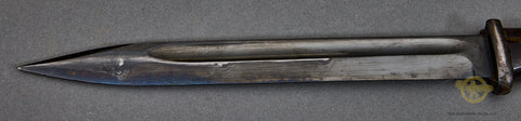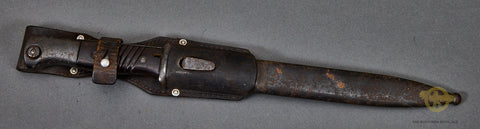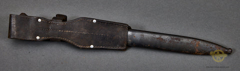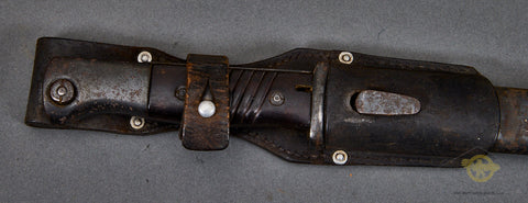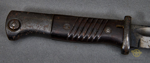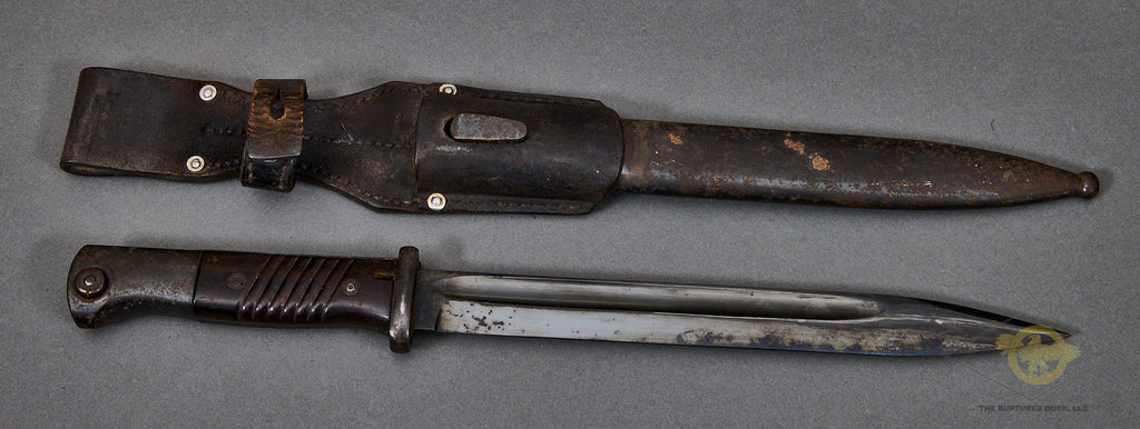 German WWII Bayonet for 98K Rifle-This is matched set. A good example and is a matching set. Both the blade and scabbard are stamped with 2340. The blade is marked 41ASW for the year of manufacture and the maker E&F Hörster. The finish on the hilt and the scabbard is missing for the most part and there is very slight rust on the scabbard. This could clean up should you choose to do so. The grip plates are made of a brown ribbed bakelite material. The blade has a good portion of the bluing intact. This is complete with a brown leather frog that is also in good shape.