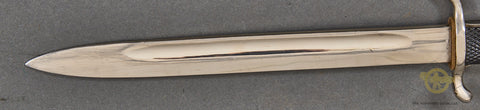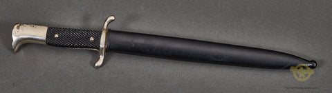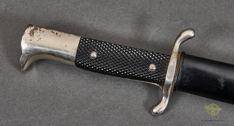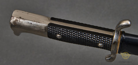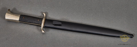 German WWII Long Model Fireman’s Bayonet-This is a handsome example. The nickel silver fittings retain 95% of their original finish. The black checkered bakelite grips are in very good condition. The leather buffer is in place under the crossguard. The scabbard has been repainted, so the paint is 95% in place, but is not the original finish. The blade on this piece is very nice, you can still see some of the faint factory cross graining, and of course the in and out marks. Overall, this is a very decent fireman’s bayonet and priced to sell.