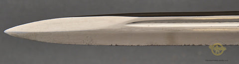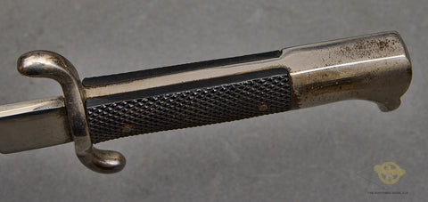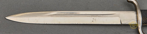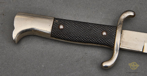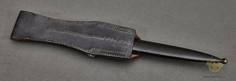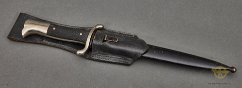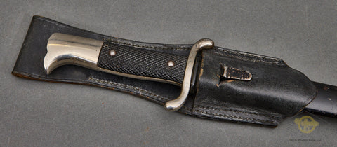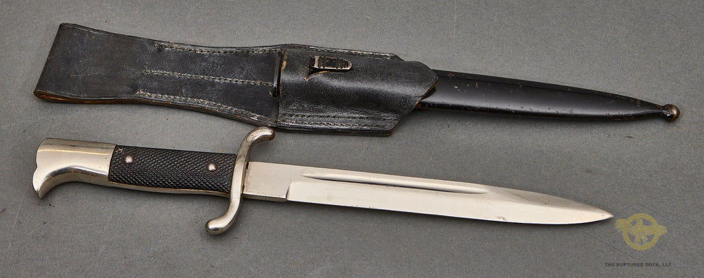 German WWII Long Short Fireman’s Bayonet-This is a handsome bayonet. The hilt and pommel fittings retain 95% of their original matte nickel silver finish. The black bakelite checkered grip plates are very good. The leather buffer below the crossguard is missing. The scabbard retains 85% of its original black paint. It is in very good condition, with no denting. The blade is near excellent, and is unmarked, as are many of these bayonets. This black leather frog has been with this bayonet forever. This is a very desirable example.