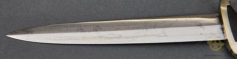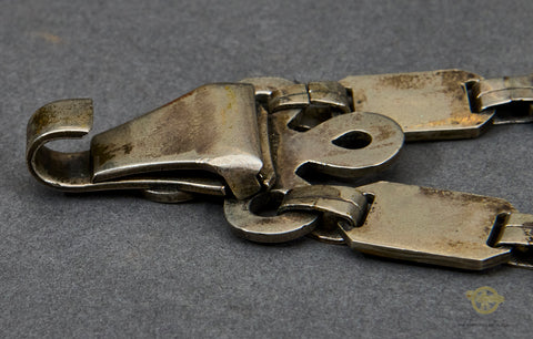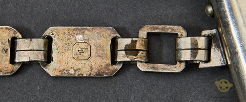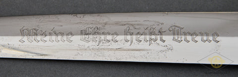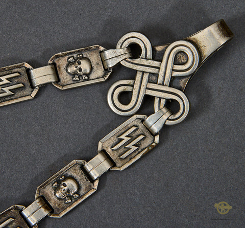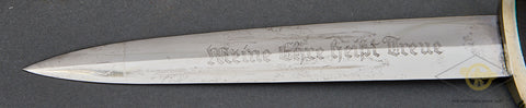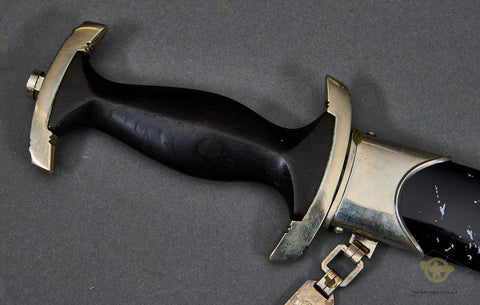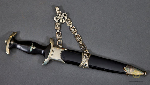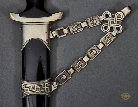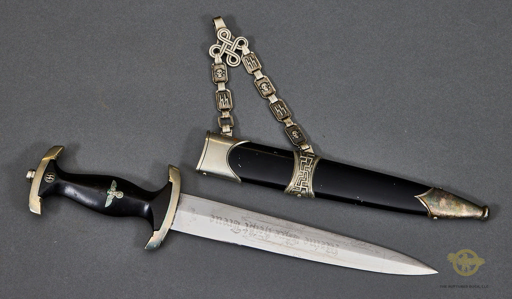German WWII Model 1936 SS Chain Dagger-The nickel-plated fittings on the cross guards, scabbard fitting and the handsome chain are 90% virtually intact. The black ebony wood grip with its nickel-plated eagle and enameled runic button are very good, as is the grip and blade fit. The eagle has a slight bit of verdigris around the eagle’s head. The scabbard has been repainted at some point. The chain is in very good condition, with the reverse of the chain showing the SS mark on the correct link. The snap clip on this chain is broken; it has lost its “spring”. The blade is very good, though it does have some spotting. It has been cleaned up. The deeply engraved motto “Meine Ehre heist Treue” (My Honor is Loyalty) is very clear. This is a strong very good example of a chained dagger.