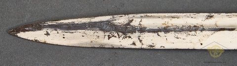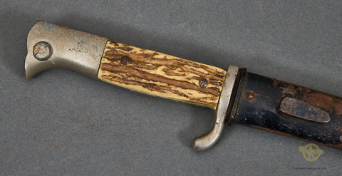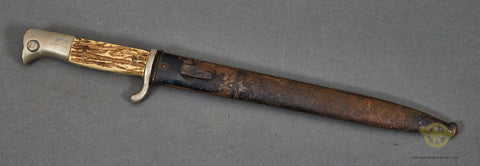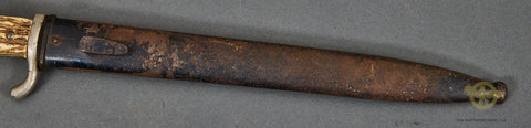 German WWII Stag Handle Long Model Dress Bayonet by Puma-This bayonet is in “as found” condition. The matte silver finish remains on the pommel and crossguard. The mortise button works as it should. The stag handle is in very good condition. The steel scabbard has lost all of its original black finish, it is now coated in rust and does have several dents. Please be sure to look closely at the photos. The blade shows some pitting down the center, and on the tip. The Puma log can be seen just under the crossguard. In “as found” condition, with the stated liabilities.