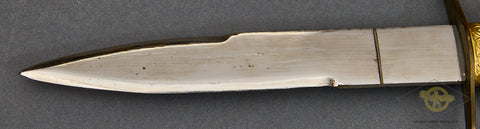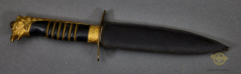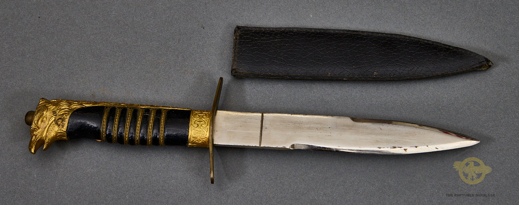 Italian Fascist Youth Knife-Gioventu Italiana del Littorio organization was the Italian Fascist Youth organization. This youth dagger has a cast brass eagle head with brass eyes. The gold gilt on the ornate fittings is in place and in very good condition. The black lacquered grip handle is good, except for small chip under the chin of the eagle’s head. The gold twisted grip wire are very good. The blade shows quite a few in and out marks but is overall very good. The scabbard is made of hard leather with studs for a belt loop, the loop is missing. See Fred Stephens reference on Italian Fascist Daggers. This dagger is an excellent example.