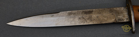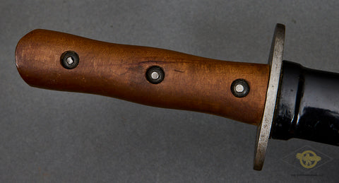 Italian Model 1939 Italian Fighting Knife-Who doesn’t love looking at these sassy Italian fighting knives? They have a style that I find very appealing. The finish on the steel crossguard is missing, but the remaining steel is beautifully toned. The warm brown handle with three rivets is in very good condition. The black enamel paint on the scabbard is 90% intact. The leather buffer is in place under the crossguard. The 8 inch (20.32cm) unmarked blade is in very good condition overall, with only slight water spots. This knife measures 13 ½ inches (34.29cm) total when in its scabbard. A handsome piece in near excellent condition.