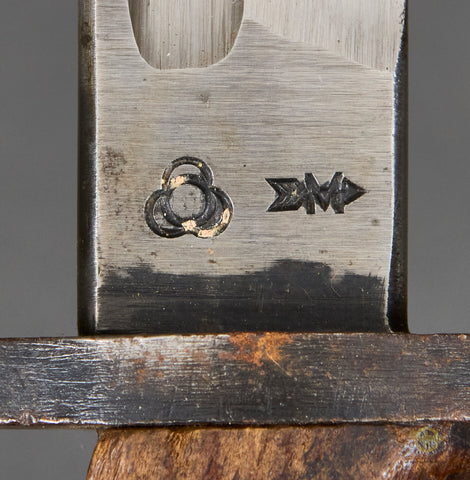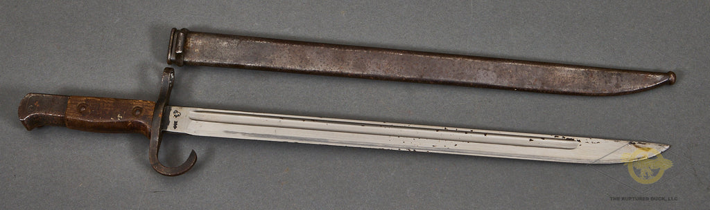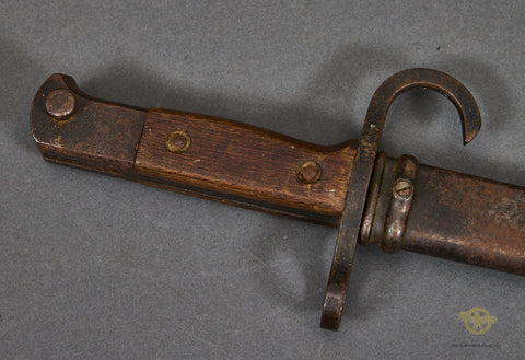 Japanese WWII Type 30 Bayonet-The type 30 bayonet went through many variations as the war raged on and resources became very limited. You can tell this is an early war production since it has the hooked quillon on the crossguard, and steel birds head pommel. This bayonet also has a serial number stamped onto the top of the pommel. Both of these have lost their original finish and have toned to a nice gray steel color. The grip plates are wood, held on with two rivets. This example has no washers. The wood handles had been chipped in areas, a long time ago, but these have since been smoothed down from use. The mortise button works as intended. Another early characteristic of an early production is the steel scabbard. This one has lost its finish. The steel has toned to the same color as the upper fittings. The blade on this example is the bright example, not blued. It is in very good condition. The maker’s stamp can been seen just under the crossguard. The ”M” and arrow makers mark refers to the Matsushita National Denki or the Matsushita National Electric Co. This bayonet measures in at 21 inches (53.34cm) long, with a blade that measures approx. 15 ¾ inches (40cm) long. A desirable bayonet.