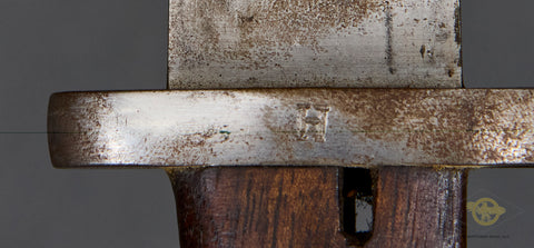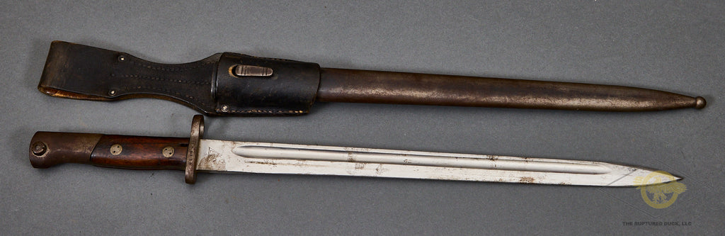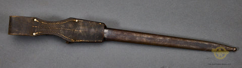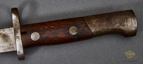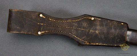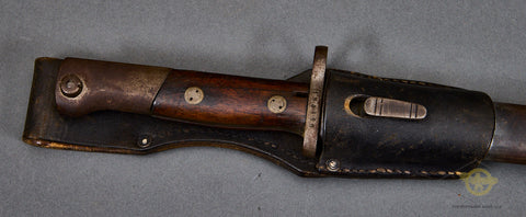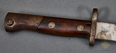 Serbian/Yugoslavian Sword Model 1924 Bayonet-This bayonet would be for use with the 8 mm. Yugoslavian M1924 Mauser Short Rifle, closely patterned after the FN M1924 short rifle. This has a nicely worn wooden handle with steel fittings that have a nice tone. The mortise button functions as it should. The crossguard with ring is marked along each side, the serial number 134423 can be seen on one side, with an “H” on the other. The steel scabbard has lost all of its original finish, but has a nice vintage look to it, with a light coast of rust. The throat of the scabbard is marked with a “P”. The blade is well marked as well. This example was made at the Vojno Tehnicki Zavod (Military Technical Institute) in Kragujevac, as you can see by the BT3 in a triangle on the ricasso. When originally made, the blade would have been in the white coating powder. This example has been well used, but it is very good condition overall. The blade measures 15 inches (38.1cm) in length. The complete bayonet measures 21 ½ inches (54.61cm) in total. This comes with a nice leather frog, that shows wear, but is in good shape.