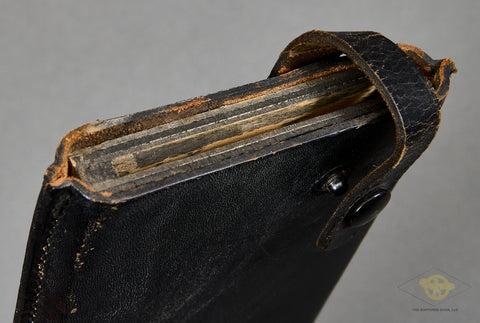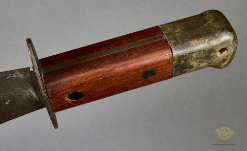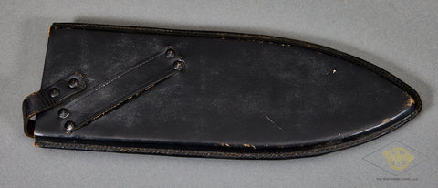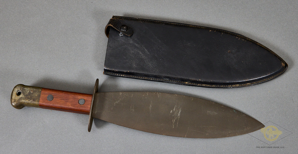 WWII British OSS Heavy Fighting Knife w/Scabbard-This is a choice example of a British OSS heavy fighting knife, also known as a smatchet. This is a formidable fighting knife/machete designed by William Fairbairn for close-quarters combat, used by elite British SAS and American OSS operatives for covert missions. It is known for its heavy chopping power, unique shape, and psychological impact. It served as a brutal but effective silent weapon for behind-enemy-lines operations. The pommel is made of solid cast aluminum and is strong enough for use as a weapon itself. The wooden grip plates are held on with two large rivets. The wood has toned to a nice dark brown color. The steel crossguard has lost any finish it once had but has toned to match both the pommel cap and blade, giving this an awesome look. This measures 16 ½ inches (42cm) in overall length, with a heavy 11-inch (27.94cm) blade. The unmarked blade is excellent. This comes with a black scabbard that is actually rarer than the knife. This is hardwood covered in black leather that is excellent. This is an amazing offering.
