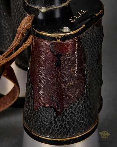 Cased Japanese Binoculars 7 x7 by Tokyo Optical-These are 7x7 binoculars. They are in very sound condition. The pebbled leatherette covering is tearing and flaking off, so please be sure to see the photos. They are maker marked with a logo for Tokyo Optical (now known as Topcon). There is a serial number No.5521. They are also marked for JES which stands for Japanese Engineering Standards, which was the technical standard used in Japan before and during WW2.  This has an original brown leather shoulder strap that is in fine condition. The optics do need to be cleaned. They work but are a bit cloudy. The beautiful khaki canvas case is slightly faded, but is in good shape, and includes the shoulder strap. Be aware the closure strap is in place, but the closure button is missing. This case is very nicely marked under the lid in kanji. A fine set overall!