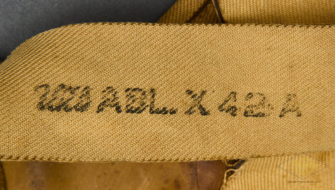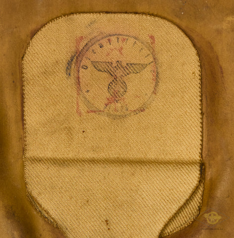 German WWII Kriegsmarine Life Preserver-This is produced in rubberized tan canvas which has some minor wear and discoloration. It is complete with the inflator and the mouthpiece. The main strap and all buckles are present. There is a number stamped on one of the straps, and a very nice navy proof at the top of the piece. Great condition!