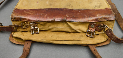 German WWII Political Rucksack-This rucksack is made of brown canvas with soft brown leather trim. The front flap is not reinforced. It is a canvas flap that buckles closed. The front of the backup has 4 leather loops attached to the front. This canvas flap has some discoloration to it, so please be sure to look closely at the photos. There is also a small spot of discoloration to the canvas on the reverse of the pack. The leather straps and buckles are all in good condition. This includes shoulder straps with attached buckles and hooks. The inside is very clean and has a folding canvas with leather straps and buckles to hold everything in place. This pack measures 14 inches (35.56cm) long and 12 ½ inches (31.75cm) wide. This is a great looking rucksack. Priced right!