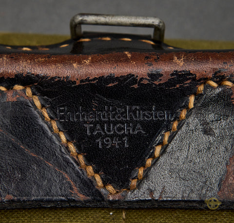 German WWII Wehrmacht Backpack- Maker marked and dated 1941. The body of the pack is light olive-green heavy canvas that is in very good condition, with some wear and discoloration. The straps, buckles and buttons are all present, working and in sound condition, although some of the leather has stiffened from age and use. This model would attach to the combat straps and did not have built in straps. A very nice and clean example.