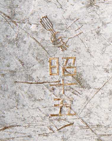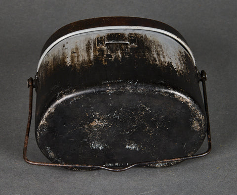Japanese WWII Mess Kit-This Japanese WWII mess kit, is known as the Ro as it does not have the inner tray. This is a kidney-shaped aluminum pot with a lid. This served as both a rice cooker and eating dish. They would often be used over open fires and you can see that this one still shows the scorch marks from cooking. It has the wire carrying handle, and a buckle on the front. This is in overall very good condition. This is nicely marked on the reverse of the bottom piece.
