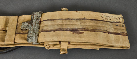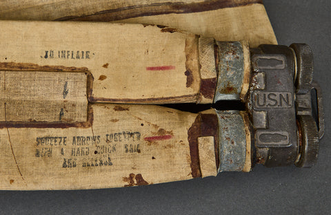 US WWII D-Day Style Inflatable Flotation Life Preserver-There is a great scene in the movie Saving Private Ryan where you see Tom Hanks and Tom Sizemore on the landing craft on their way to the landing site. You can see the inflatable devices around their waists. This is what we are talking about here. A M1926 Flotation Belt Life Preserver, which is heavily rubberized canvas that inflates, hopefully keeping you above water with your 70 to 90lbs of gear on. The belt was inflated by squeezing two switches located inside the belt, which activated two CO2 bottles. If the CO2 bottles failed, the belt could still be inflated by blowing into the rubber tubes, which have valves on the ends. This type of belt is particularly known for use during the D-Day landing on the Normandy beaches on June 6th, 1944. This is very well marked for the maker, you can see the stamped CONTRACT No. W 33 034 96 EAGLE RUBBER CO., INC. ASHLAND, OHIO Dec 4, 1944. The metal buckle that would surround the CO2 containers shows the USN marking. The instructions are stamped on the canvas, close to the CO2 slots and indicate: "To inflate squeeze arrows together with a hard quick grip and release". This shows discoloration but is overall, in very good condition. This is a very desirable piece, and one we certainly do not see very often.