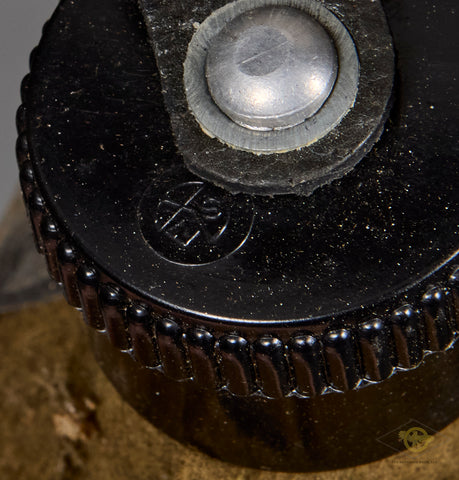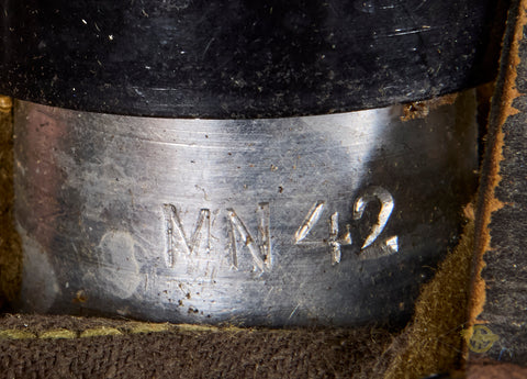 WWII German Canteen with Bakelite Cup-Very good example of a field canteen, with a brown felt cover over the aluminum body. This example has the black bakelite cup. The black smooth leather straps are intact and in good shape. The main strap has stiffened by buckle so we did not loosen. The spring clip works great with a D ring and loop. The brown felt covering is in good condition with some moth tracking. All of the snaps are in place and functional. The bakelite cup is present and nicely marked with the GFC code (Julius Posselt, Gablonz an der Neisse, Sudetenland) and 1942 dated. The bakelite screw cap is in place with cork seal. The aluminum canteen is marked on throat MN 42. This is a good example ready to add to your kit!
