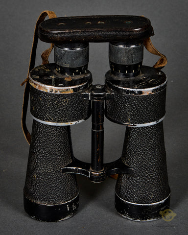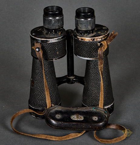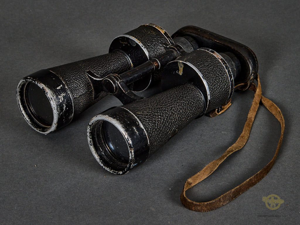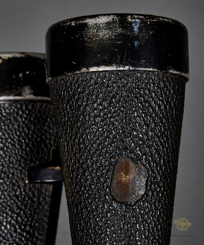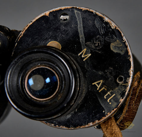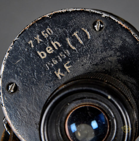 WWII German Kriegsmarine 7 x 50 Binoculars-This set was for use by the artillery of the Kriegsmarine as it is marked with an eagle over a capital “M” as well as “Artl.”. The pebbled dark brown leatherette coverings is mostly intact, with a small section missing on the left barrel. The black finish to the aluminum pieces remains partially intact. One side is marked as mentioned earlier while the other side is marked #7 x 50”, “beh”, serial number “356359” followed by “(T)” and finally, “KF”. “beh” is the ordnance code for Ernst Leitz GmbH, Wetzlar. The optics are in fine condition but could benefit from a cleaning. There is a leather strap with a thick leather cover for the eye pieces. Good condition!