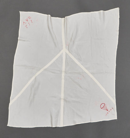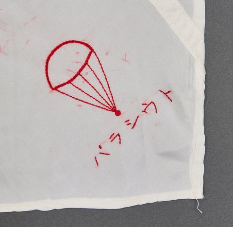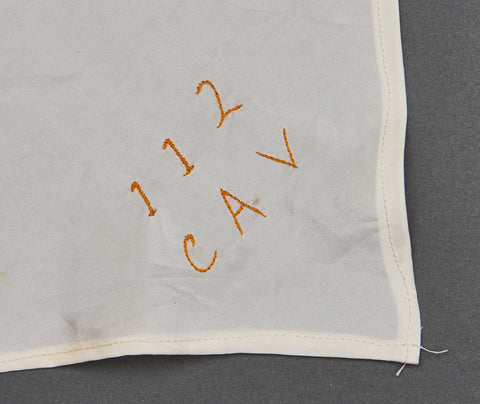 WWII Japanese National Meatball Flag and More- This interesting lot of flags and banners comes from two US Army veterans. Their names will be provided to the buyer. One brother served with the 315th Infantry Regiment which landed on Utah Beach on June 14 1944 as part of the 79th Infantry Division. He saw much action. His brother served in an armored unit. Likely in the PTO. The Japanese Meatball flag is in very good condition. Made of silken material with both tie ends present. Measures 35” x 36” (89cm x 66cm). There are two sections of Japanese parachute. Each has a 112 Cav stitch in corner and the other has a stitched parachute and Japanese lettering. Included in this lot is US Army banner for Desert Training Center Area. A neat grouping!
