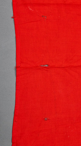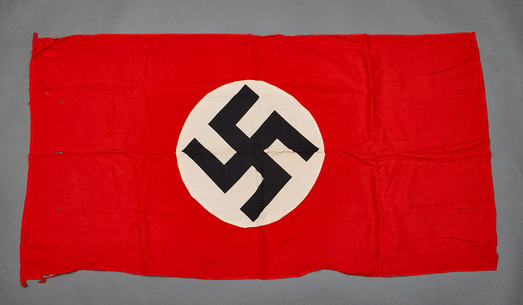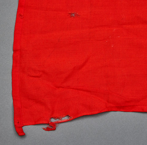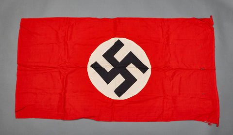 WWII NSDAP Party Flag- This flag is two sided multi piece construction. It is rather clean and produced in a smooth red cloth. It measures 3' 7" by 7' 9". There is a separately applied white cloth disc/printed black swastika on each side. The hoist end has two tabs for hanging. The GI had it hung with nails and there are 6 holes form years of hanging. This was purchased from the veteran’s family and his name and some info will be provided to the buyer. The veteran was part of the 48th Combat Engineers who were attached to the 101st airborne Division. Excellent flag with equally excellent provenance!